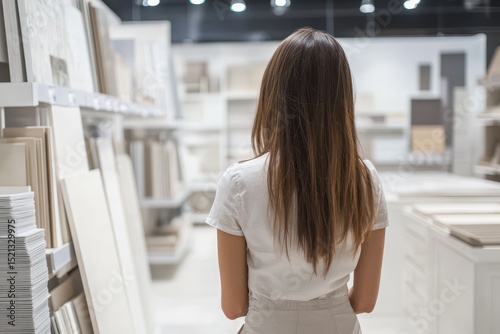 Stylish Showroom: Woman Curating Fresh Details for Kitchen Makeover in Home Improvement Space