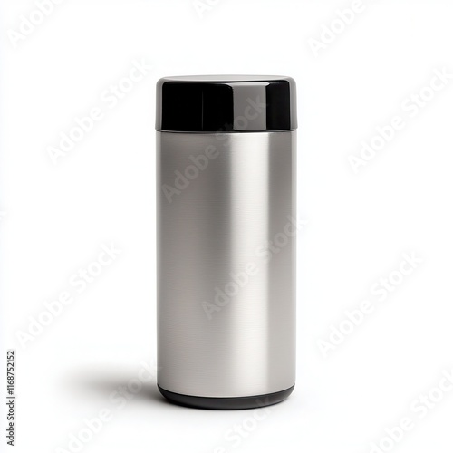 Stylish stainless steel thermos with a black lid, perfect for hot or cold beverages.
