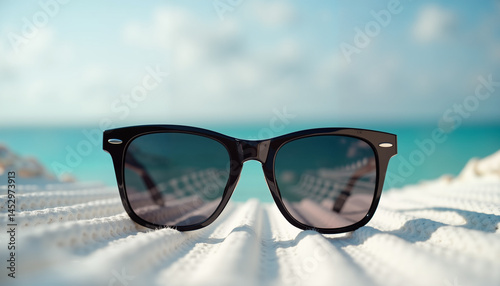 Stylish sunglasses resting on a beach with a blue sea background