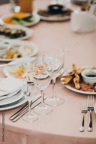 stylish wedding setting, tender pink table with wine glasses, cutlery, napkin and delicious food and drinks. luxury catering in restaurant. modern wedding reception