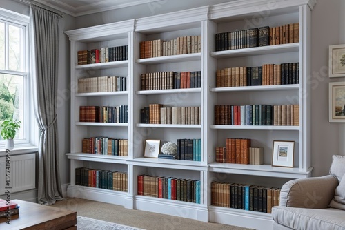 Stylish White Bookcase with Hardcover Books in Contemporary UK Living Room Decor