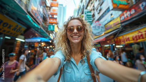 woman, white, sunglasses, stylish, standing, bangkok, selfie, trendy, holiday maker, fashion, urban scene, city landscape, downtown, travel, tourist attraction, lifestyle, leisure, day, sunny, tour tourism, modern, city life, casual clothes, outdoors, exploring, adventure, smiling, confident
