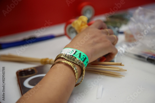 Stylish wrist with gold bracelets and a green event band. Perfect for fashion blogs or craft project promotions. Captures creativity and modern style in detail.