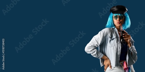 african american, blue, drink, soda, space, stylish, text, wig, woman, young, accessory, background, beautiful, bottle, cap, clothes, colours, copy, dark, denim, fashion, fashionable, female, girl, glamour, hair, hat, jean, lifestyle, look, model, outfit, people, person, portrait, posing, pretty, style, sunglasses, trendy, wear