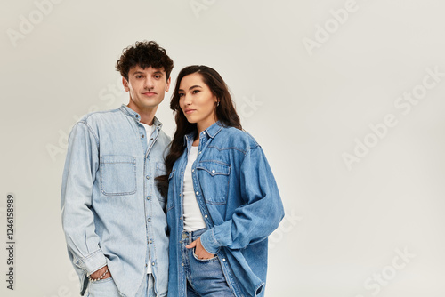 Stylish young couple showcasing modern denim fashion in a minimalistic studio setting