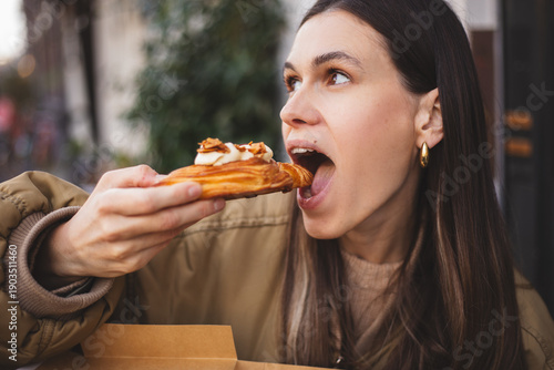 woman, biting, pastry, dessert, crispy, cream, flaky, sweet, delicious, epicure, bakery, cafes, lifestyle, portrait, stylish, happy, enjoyment, treat, snack, female, young, brunette, candid, closeup, hand, expression, authentic, joy, breakfast, brunch, epicure, sugar, indulgence, tasty, appetising, texture, urban, city, modern, daylight, travel, tour tourism, pleasure, hot drink, artisan