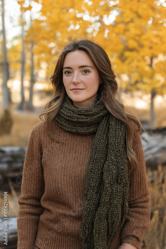 stylish young woman in a brown sweater and green scarf enjoying a bright autumn day, ideal for fashion campaigns