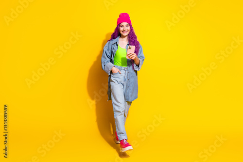 female, woman, girl, young, hipster, fashion, model, stylish, trendy, denim, jean, jacket, beanie, casual attire, style, pink, dyed, hair, beautiful, attractive, charming, lovely, happy, funny, yellow, background, advertising, shopping, promoting, vibrant, smile, youthful, joy, phone, smartphone, urban, fun, colourful, unique, confident, portrait, positive, energetic, trend, creative, artsy, shirt, going, walk, outfit