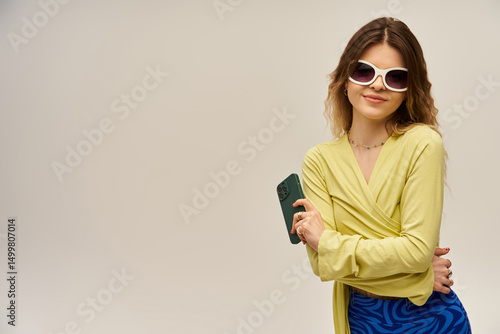 smartphone, sunglasses, missy, beautiful, stylish, outfit, fashion, grey, young, woman, background, confident, pose, trendy, accessory, modern, chic, elegance, casual attire, attractive, posing, portrait, friendly, relaxed, choice, natural, light, beauty, colours, contrast, wear, eyewear, smile, grace, individuality, gracefulness, allure, social, media, contemporary, stance, aesthetic, artful, bliss, dream