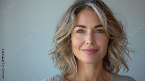 middle-aged, european, woman, grey hair, stylish, fashionable, clothes, light, facing, camera, beaming, smile, solid, background, confident, cheerful, positive, elegant, trendy, portrait, happy, joyful, mature, attractive, caucasian, radiant, optimistic, grey hair, upbeat