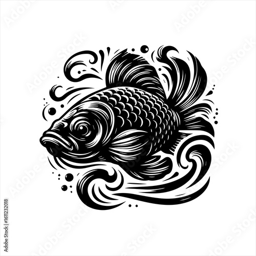 fish, betta, aquatic, animal, wildlife, nature, water, swimming, fin, scale, black, white, illustration, graphic, design, art, drawing, vector, ornamental, decorative, stylised, elegant, graceful, movement