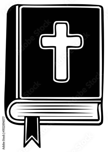 Stylized black and white illustration of a closed holy bible with a Christian cross on the cover and a bookmark