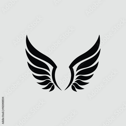 wing, graphic design, design element, vector, illustration, icon, symbol, logotype, angel wings, black-and-white, monochrome, silhouette, wingspan, flight, freedom, power, speed, strength, spirituality, heaven, fantasy, mythology, tattoo, emblem, badge