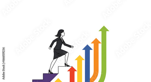 Stylized Businesswoman Climbing Colorful Career Ladder Toward Multicolored Growth Arrows – Conceptual Success Illustration