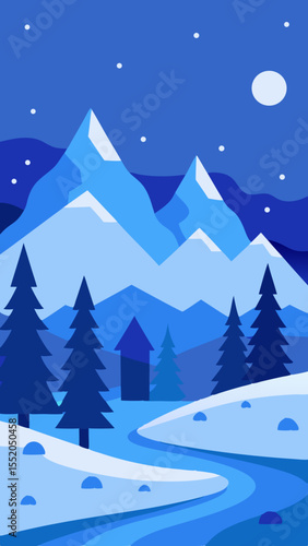 winter, landscape, mountain, snow, tree, nature, scenic, blue, night, moon, star, cold, season, illustration, flat, design, minimalist, geometric, stylised, serene, peaceful, cabin, river, stream, forest, evergreen, pine, tree, snowy, scene, weather, alpine, background, graphic