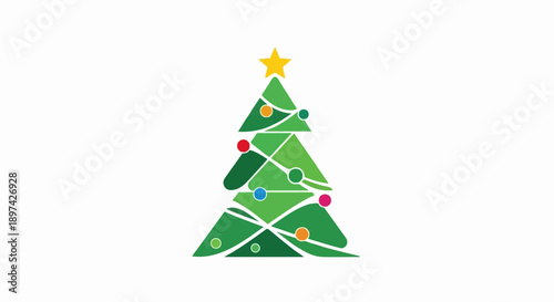 Stylized green Christmas tree with star and colorful ornaments on a white background