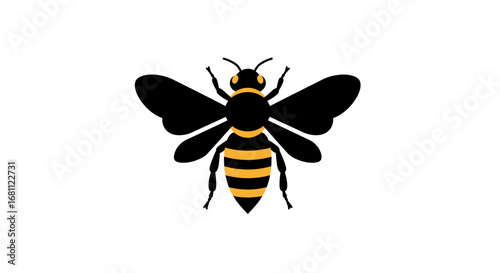 Stylized illustration of a black and yellow striped bee with spread wings on a white background