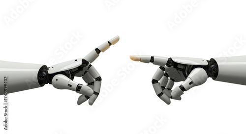 Stylized photorealistic AI hand with touchscreen handshake icon high fiving human hand. Isolated on transparent background, png