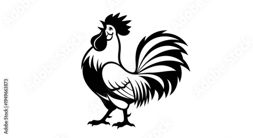 rooster, bird, animal, fowl, poultry, silhouette, vector, graphic, illustration, design, art, black, white, monochrome, isolated, background, profile, crest, feather, tail, wing, beak, claw, eye, standing, proud, bold, stylised, elegant, symbol, agriculture, farm, rural, template, element, icon, logotype, concept, decoration, print, digital, creative, ornament, character, domestic