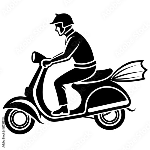 scooter, motorcycle, rider, person, helmet, riding, transportation, vehicle, silhouette, graphic, illustration, vintage, retro, travel, mobility, speed, motion, stylised, icon, design, black, and, white, isolated, clean, simple, modern, commute, delivery, 2