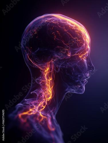 Stylized transparent head design revealing intricate brain details illuminated by vibrant electric currents against a dark background, showcasing the beauty of human anatomy and thought processes
