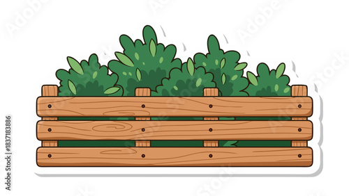 Stylized Wooden Planter Box Filled With Lush Green Bushes and Leaves Against a Simple Background.