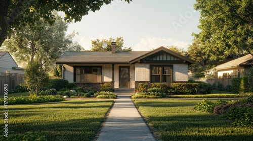 Suburban bungalow house with landscaped yard and walkway.