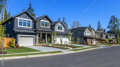 Suburban neighborhood street with a row of modern houses on a sunny day
