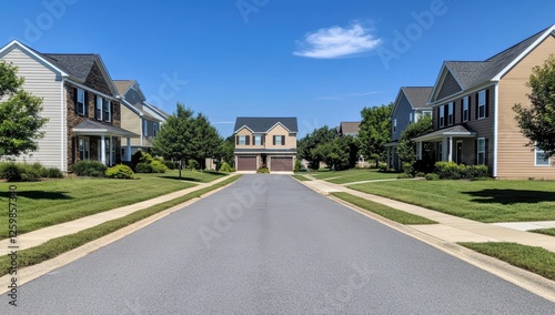 street, home, neighbourhood, suburban, house, residential, empty, road, property, community, exterior, america, family, front, new, modern, row house, development, yard, lawn, blue, sky, summer, daylight, asphalt, driveway, clean, quiet, safe, peaceful, affordable, housing, home