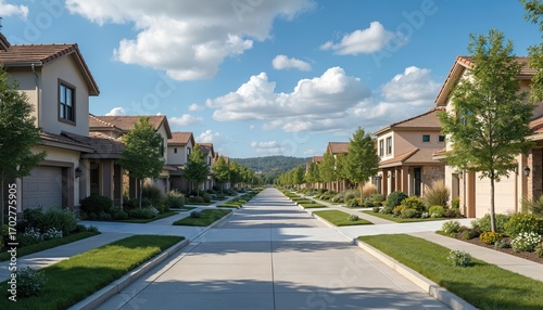 Suburban street lined with modern homes featuring neat landscaping, green lawns. Tall trees provide shade along sidewalks. Clear blue sky with fluffy clouds stretches overhead, suggesting bright