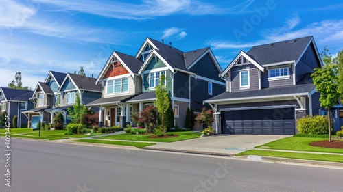 Suburban street with row of modern houses and manicured lawns under clear blue sky