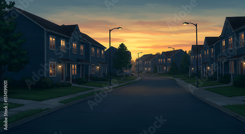 row house, suburban, neighbourhood, dusk, street, residential, home, real estate, architecture, property, twilight, street light, housing development, quiet, peaceful, illustration, digital artwork, drawn, residential area, house, building, road, sidewalk, landscape, outdoors, sky, cloud, orange sky, investment, planning, evening light, facades, dwelling, living, community, exterior, nobody, foreground, background, view