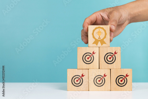 Success, winner and victory in business. A man holding wood cube with trophy icon and target icon Indicating successful planning