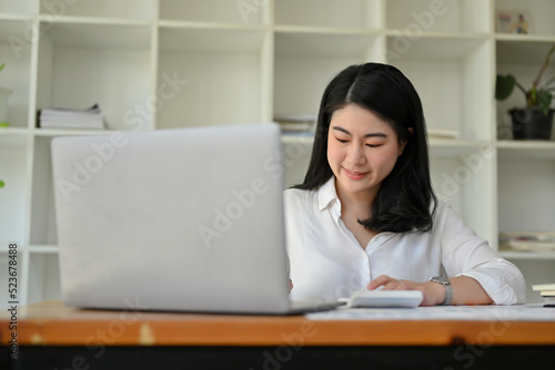 Successful Asian businesswoman at her office desk managing her task on laptop.
