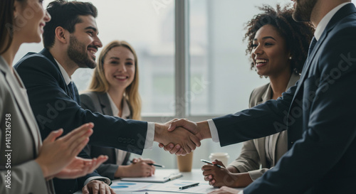 Successful business handshake diverse team celebrates a deal bright office setting with warm light
