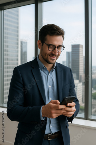 Successful businessman in glasses smiling while using a smartphone, standing by a window in a modern office with a city skyline view