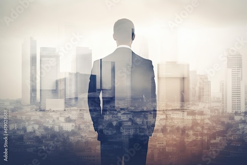 Successful Businessman in Suit Standing in Urban City with Copy Space for Professional Finance and Leadership Concept. Generative AI illustrations
