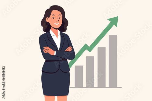 Successful businesswoman smiling confidently standing in front of rising green arrow chart, growth and success concept, financial progress, business achievement, leadership and motivation