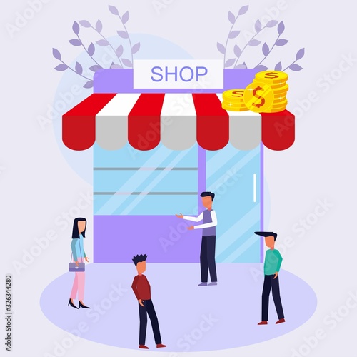 Successful entrepreneurs with loyal customers. Open a store in the morning. Modern vector illustration