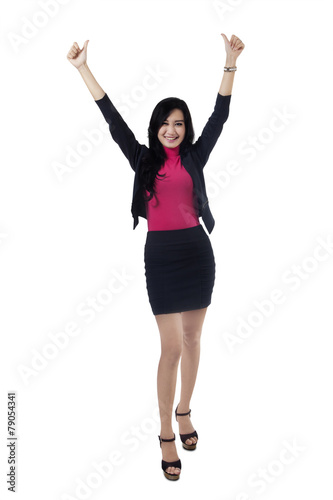 isolated, successful, asian, woman, up, white, business, raise, ok, background, thumb, person, attractive, achievement, corporate, chinese, expression, concept, adult, success, symbol, indonesian, satisfaction, men at work, female, smile, young, indian, executive, standing, hispanic, gesture, businesswoman, professional, agreements, approval, cheerful, beautiful, manager, job, office, confident, japanese, hand, happy, entrepreneur, full, length, body, celebrate