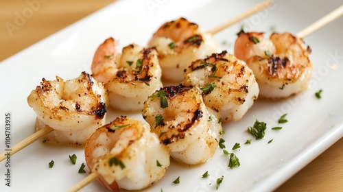 Succulent Grilled Shrimp Skewers with Charred Texture and Herbs - Close-up Ultra-Detailed Food Photography