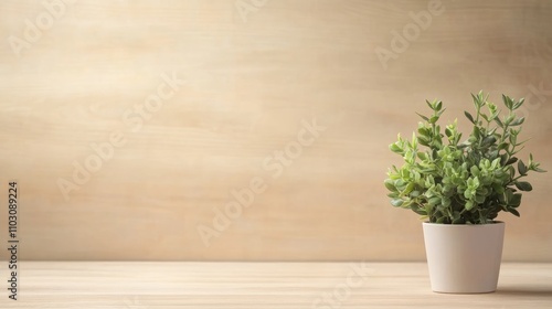 Succulent plants in a simple white pot placed on a light wooden surface with a soft beige background, ideal for text overlay.