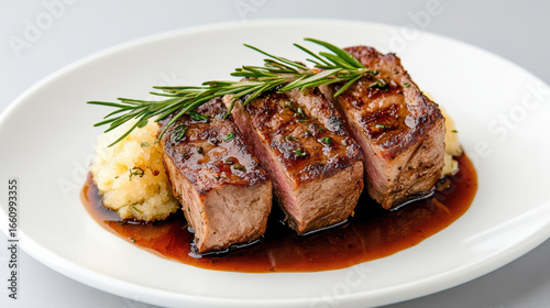 Succulent rack of lamb served with creamy mashed potatoes and rich red wine sauce, garnished