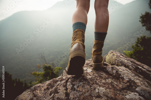 Suceesful woman hiker legs stand on mountain peak cliff edge