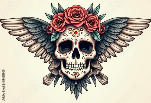 day of the dead, skull, wing, rose, flower, mexican, art, illustration, tattoo, design, graphic design, traditional, colourful, festive, celebration, culture, death, life, afterlife, spirit, soul, remembrance, symbol, icon, vintage, aesthetic, beauty, ornate, intricate, detailed, vibrant, bold, gothic, grisly, skittish, halloween