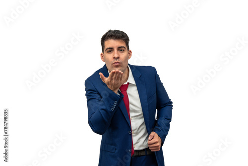 Suited Businessman Blowing Kiss with Blue Suit and Red Tie white background