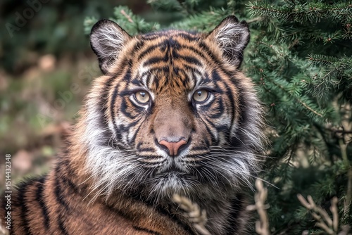 tiger, sumatran, animal, portrait, face, eye, mammal, wildlife, cat, striped, fur, close, up, carnivore, nature, zoo, beautiful, pattern, outdoors, species, rare, forest, environment, predator, wild, looking, felidae, threatened, creature, green, foliage, vegetation, bush, alert, watching, background, tree, whisker, ear, detail, savage, powerful, grass, branch, jungle