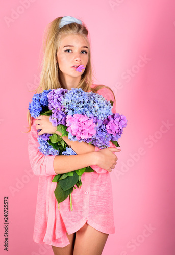 Summer beauty. Fashion portrait of woman. Healthy hair and skin. Makeup cosmetics and skincare. girl with summer makeup. Spring woman with hydrangea flowers. Complete relax