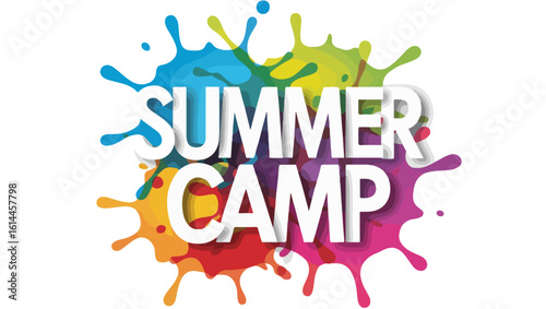 Summer Camp Text Design – Bold White Font with Colorful Paint Splashes for Youth Activities and Seasonal Promotions