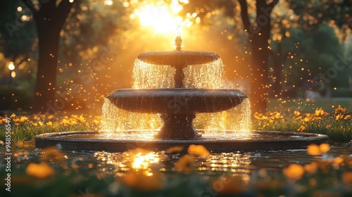Summer City Park Fountain – Golden Hour Glow, Sunlit Trees, and Photorealistic Scene